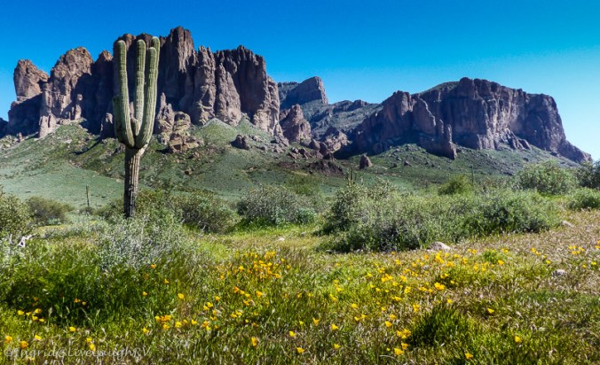 I don’t know about you, but I never tire of fantastic scenery dotted with wildflowers. During our first week back in the valley of the sun, we hiked at the Superstition Mountains as much as possible, which wasn’t nearly enough. It never is. If I haven’t already told you, well even if I have ….. I love, love, love hiking here .