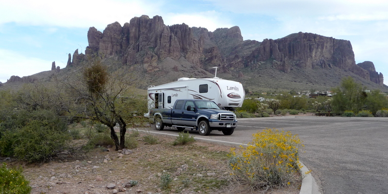 Bear and I return to a warm Rig.  Al started the coffee…ummm.  We discuss the plan for the day.  We’ve learned the hard way, Phoenix in March is busy with snowbirders and spring breakers.  Thus the campgrounds are full.  Before hooking up and driving off, Al thinks it prudent to call Lost Dutchman State Park and verify they have room for us.  Al talks to the head Ranger and the Ranger informs him no group is booked in the “group campground” prior to our Escapees group.  Thus giving us permission to set up early in the “group area”.