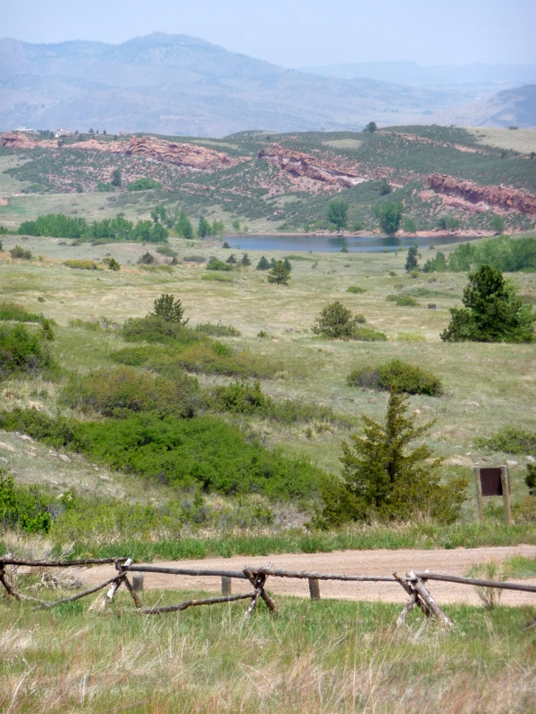 We take the road to the far end of the park. We contemplate the Arthur’s Rock Trail but opt for the Shoreline Trail which takes us toward Horsetooth Reservoir. The trail is clearly marked and easy. The red sandstone is a striking background to the grassy meadow.