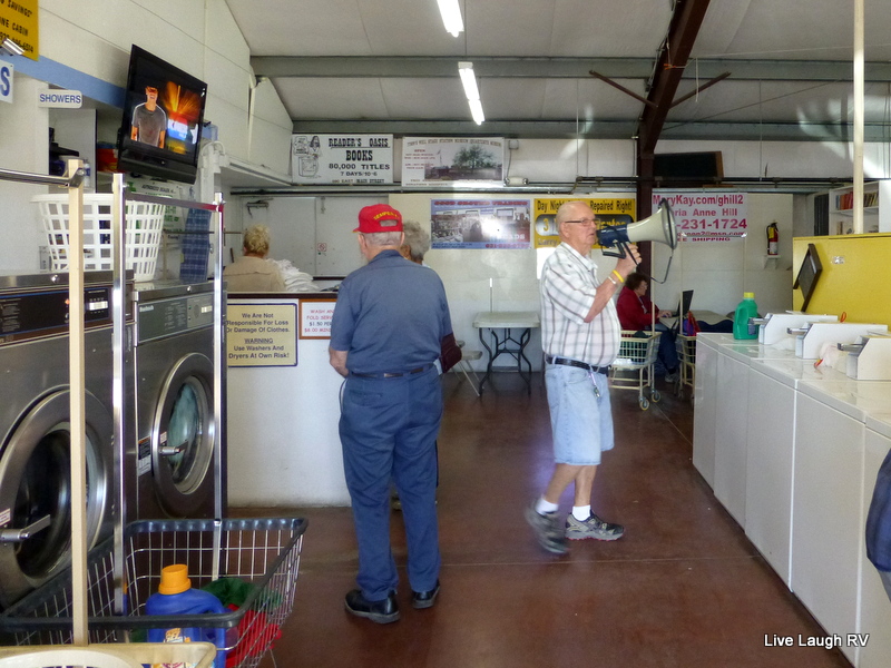 Quartzsite has a couple of laundromats. Our stay was long enough to try each once. Doing laundry at the Main Street Laundromat was an event. First it was super crowded. There were three attendants, one who seemed to love his job or rather control a little too much. He got on his megaphone to let patrons know people were waiting for machines and to remove laundry from stopped washers or the laundry would be removed by staff.