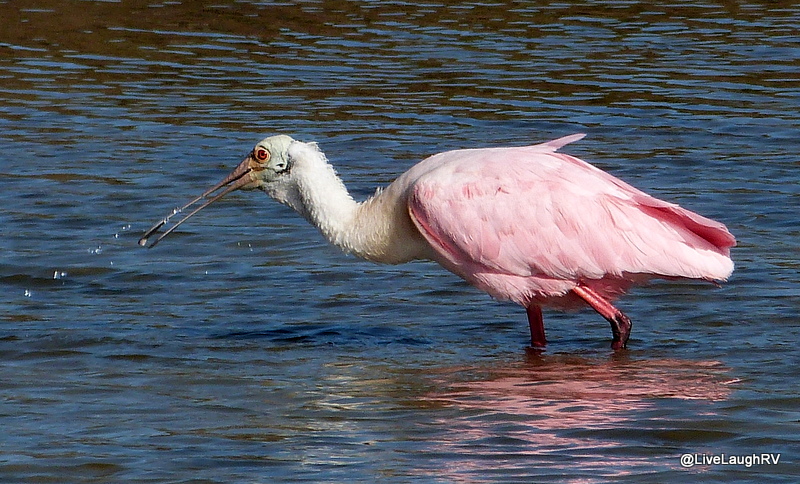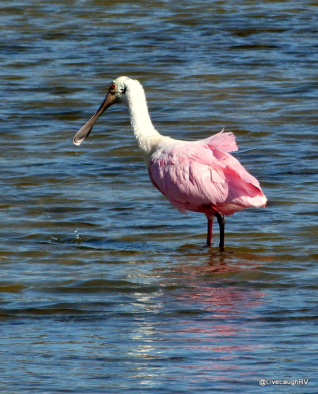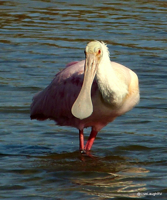 Upon my return to the RV the first task at hand is to Google roseate spoonbill. Roseate spoonbills grow to a height of 32 inches (81 cm) with an average wingspan of 50 inches (127 cm). They eat primarily small fish and crustaceans and are found throughout the Gulf of Mexico coastline. Roseate spoonbills are silent and often solitary when they feed. That could explain why this one was alone.