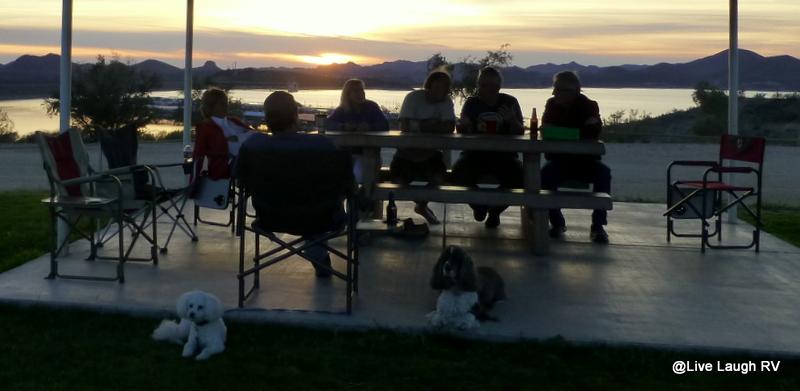It isn’t long before Al and I get settled into our new home and are invited to join our neighbors – fellow RVer’s at the community picnic table for happy hour. Most evenings found us hanging out at this picnic table enjoying snacks, drinks, fun company, and watching fabulous sunsets.