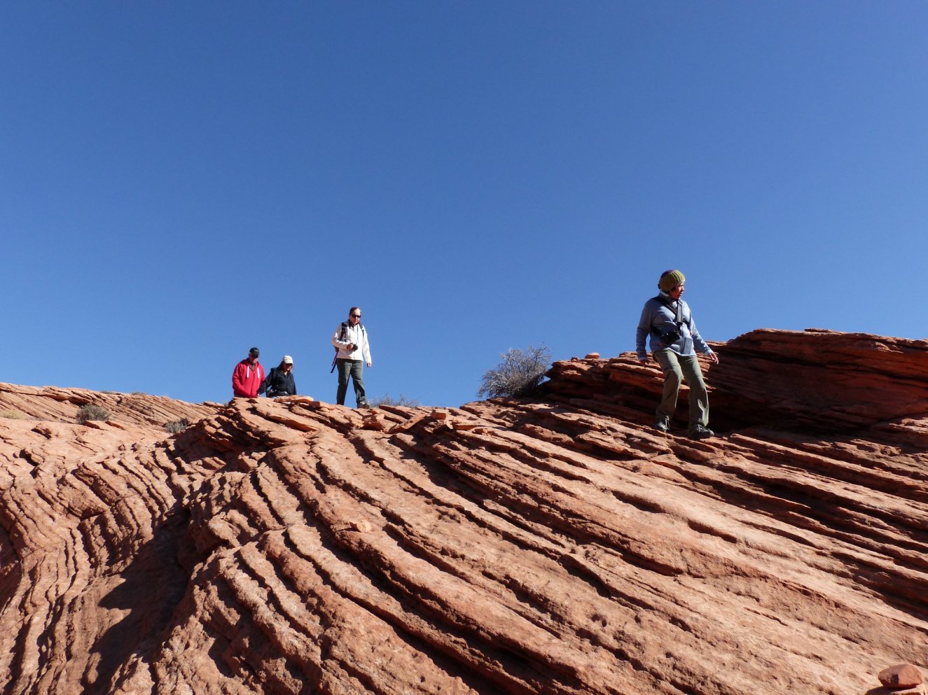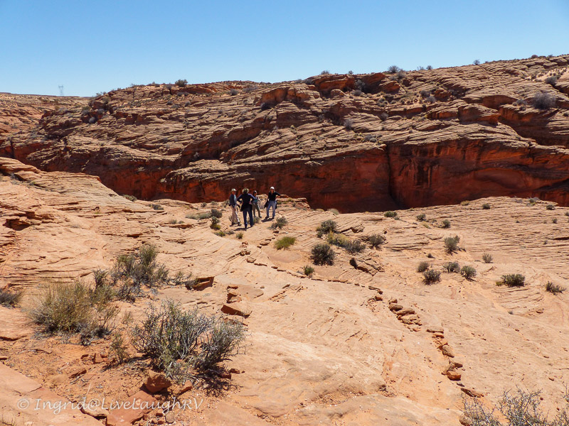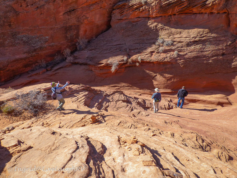 But here’s one of Dave’s photos showing us hiking down, and showcasing the kind of rock we had to walk on. This could get really slick if wet. As it was, the rock is dusted with sand and gets a little slippery in spots.