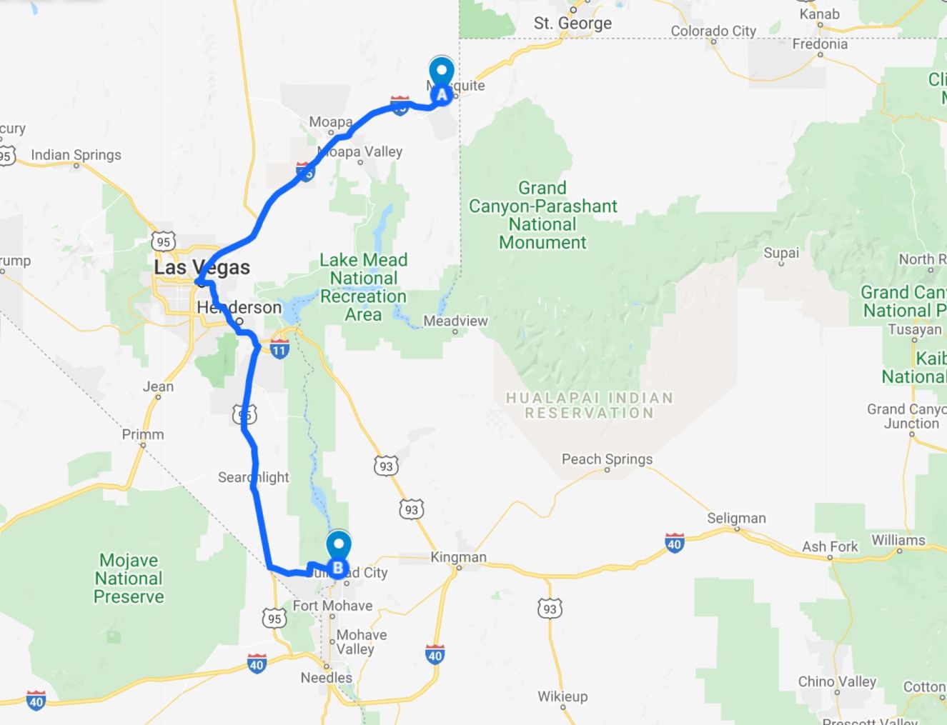 From our campsite at Stovepipe Wells, we headed west via Daylight Pass Road (Hwy 374) toward the town of Beatty, Nevada. In Beatty, we picked up Hwy 95 and headed south toward Las Vegas. Once in Las Vegas, we picked up the 215 beltway east to I-15 north. The trip took us about three hours including a stop for gas and lunch.